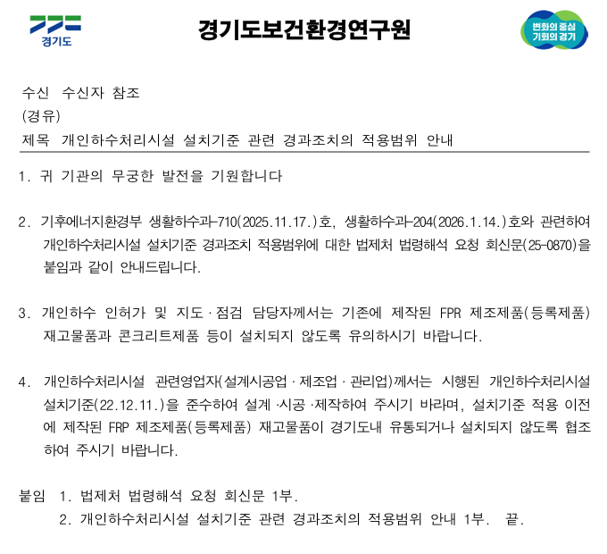 개인하수처리시설 설치기준(개정하수도법 시행령) 관련 경과조치의 적용법위 안내